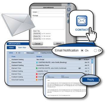 Casting and agent users may contact you by simply clicking the 'Contact' icon on your profile. Casting personnel can use this feature to book you for a job or check your availability. Or if you are seeking representation, agencies can recruit you as a new client. With the contact form, they can send you a detailed message with up to 3 attachments. Once the 'Send' button has been clicked, the message will arrive in your Inbox. You can also choose to have these messages forwarded to your email address by turning Email Notification 'On'. You (or your agent) can reply directly to the sender and a copy of all communication will be kept in your Sent Mail folder.
